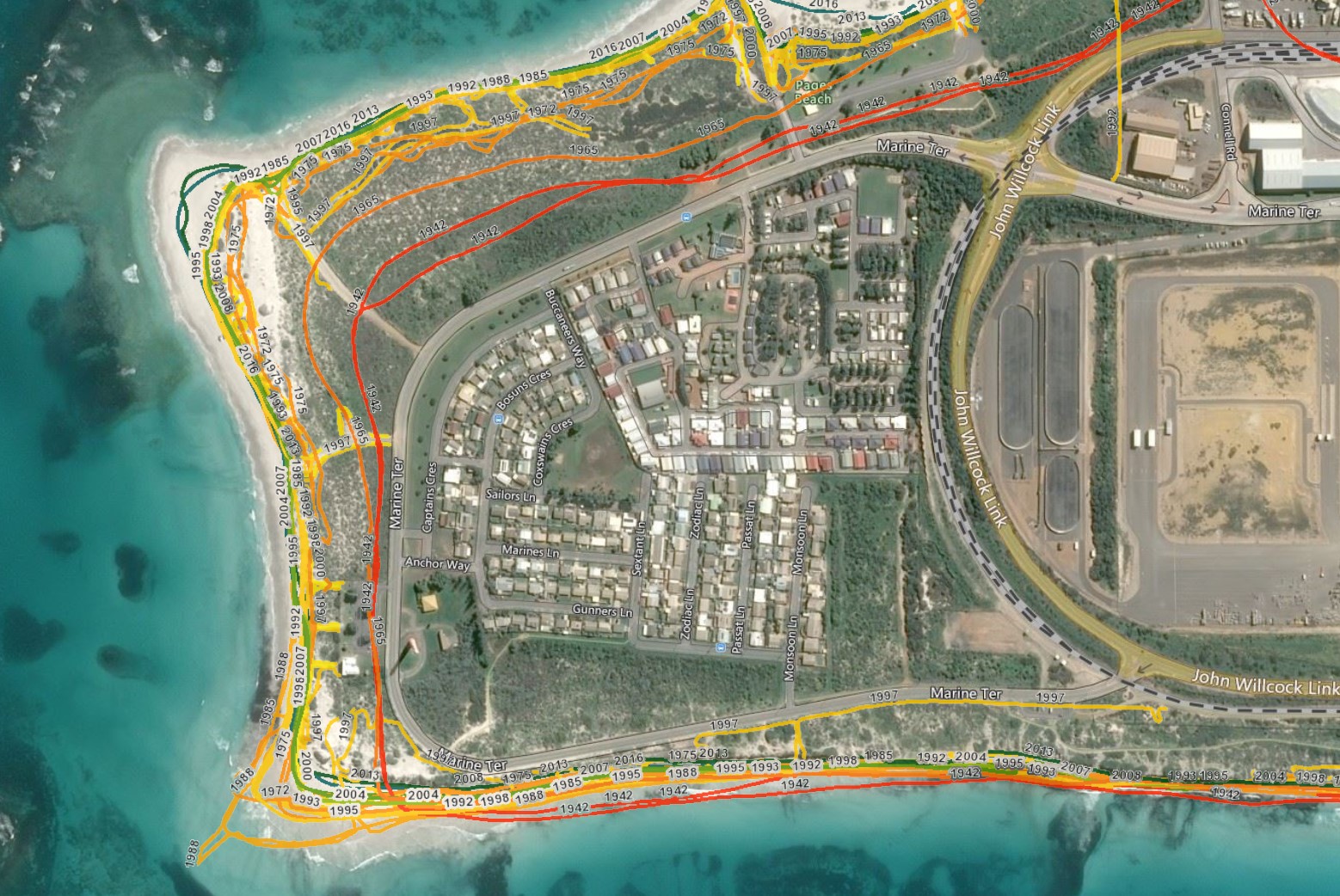 Historical vegetation lines are also a good indicator for long term changes to shoreline movements. The last 'natural' beach line was in 1965, before the groyne at Pages Beach was installed in 1967, resulting in the northern and western accretion.