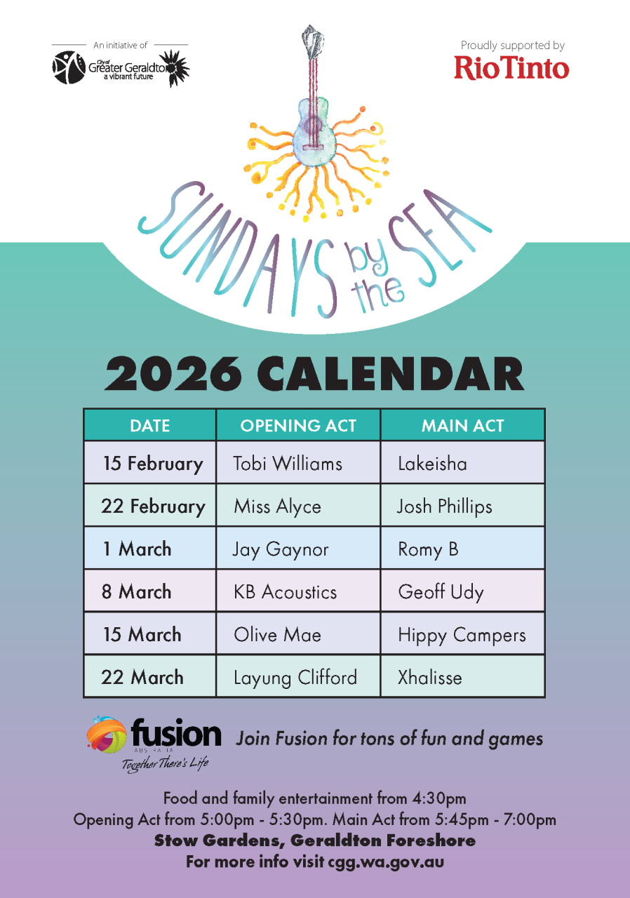 Geraldton's most loved music event is back in 2026! Sundays by the Sea encapsulates our unique lifestyle and is held in Stow Gardens, next to the Geraldton Multipurpose Centre on the Foreshore!
