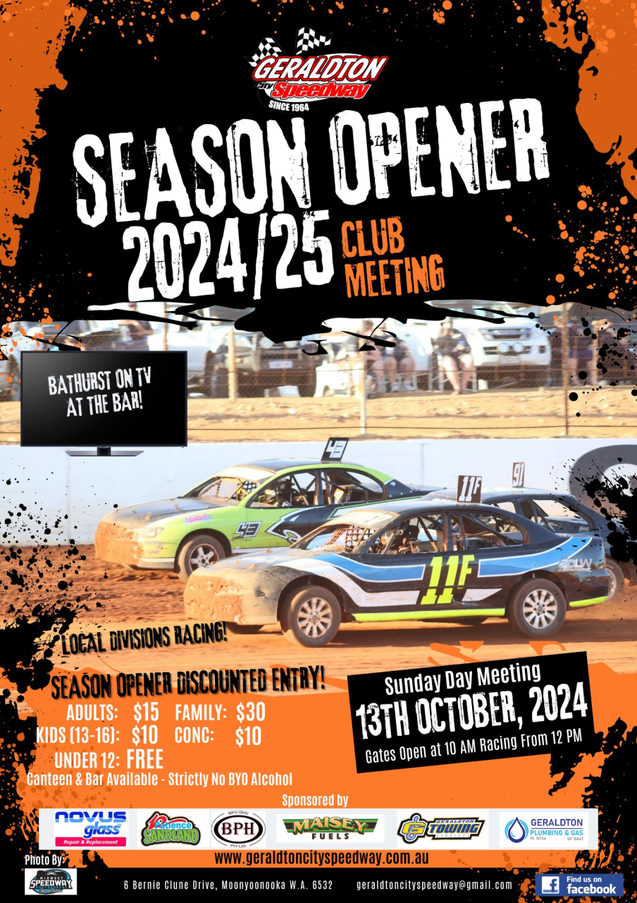 The 2024/25 speedway season opening round is to be held on Sunday 13th October 2024 at Geraldton City Speedway, 6 Bernie Clune Drive, Moonyoonooka, WA, 6532. The season opener will be a day meeting with gates opening from 10am and racing to commence from 12pm with discounted entry fees and kids under 12 free.
