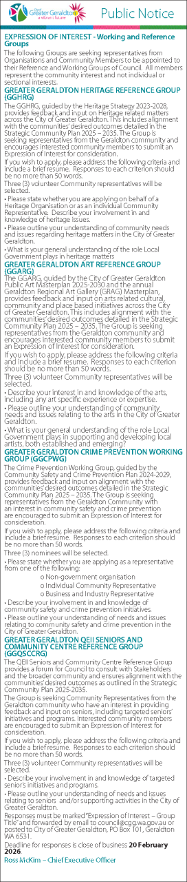 EXPRESSION OF INTEREST - Working and Reference Groups Published on Monday, 9 February 2026 at 10:06:42 AM Back to All Items