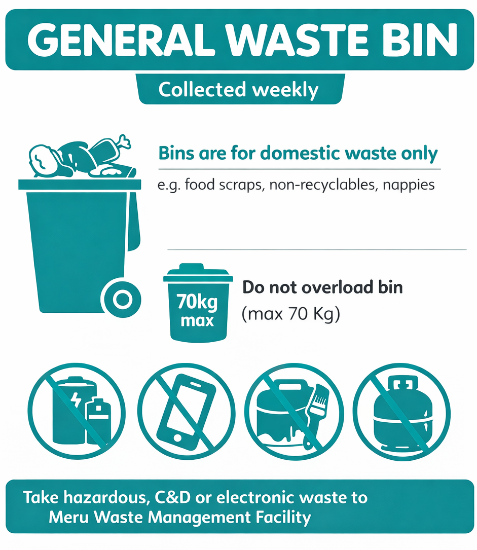 Many items that don’t belong in regular collection can be dropped off at the Meru Waste Management Facility.