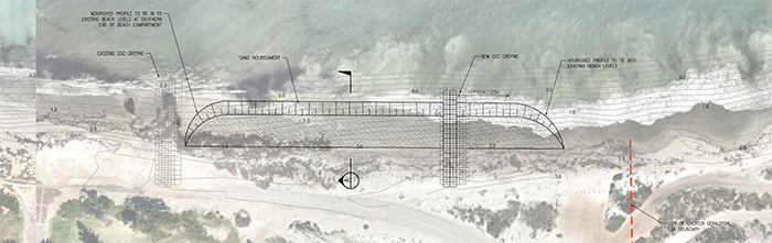 The 37m long GSC groyne, which extends across the beach and into the ocean, is designed to retain sand at Whitehill Road and reduce reliance on temporary sand nourishment operations.